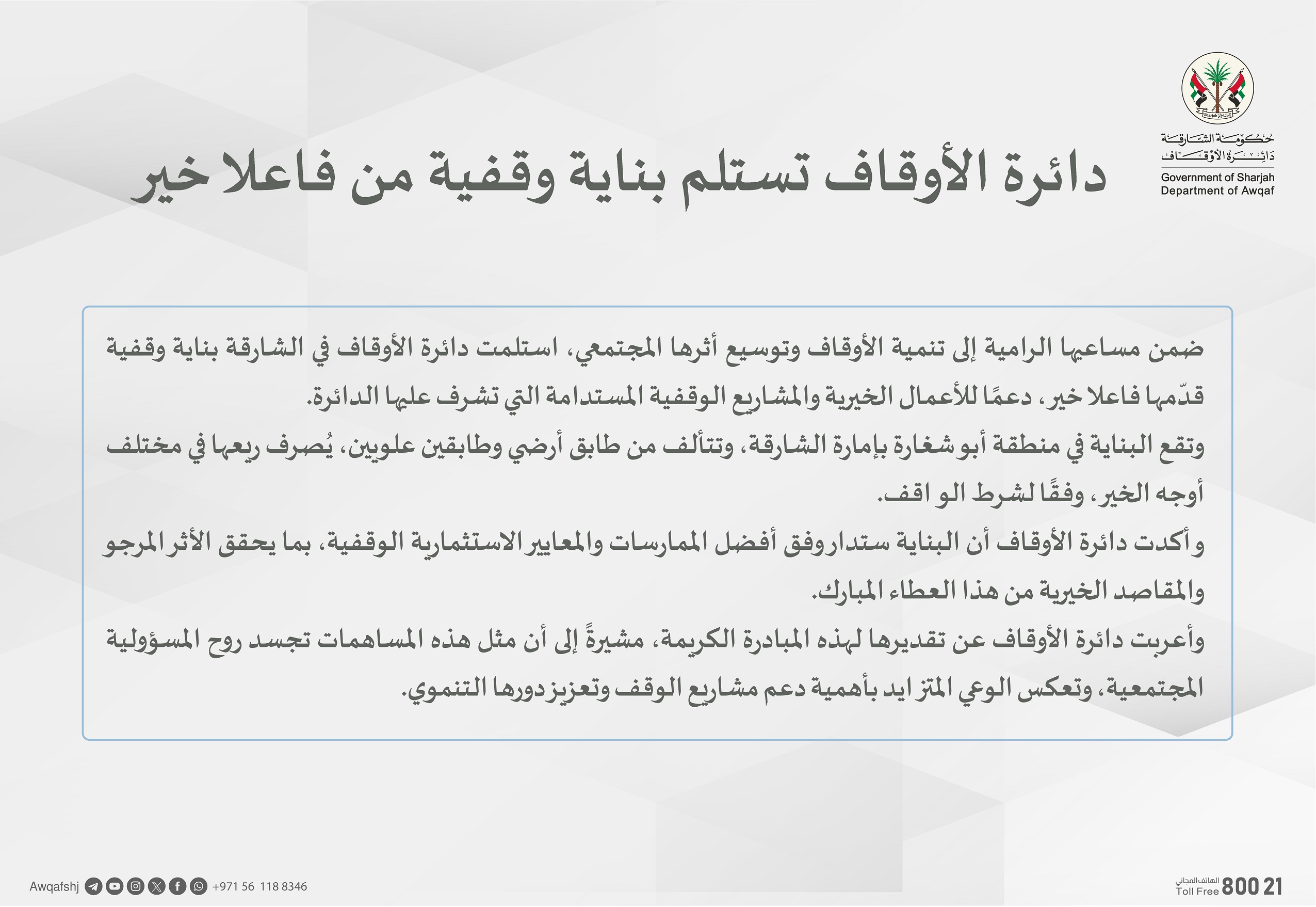 ضمن جهودها المستمرة في تطوير وتنمية أصولها الوقفية، أنجزت دائرة الأوقاف في الشارقة مشروعًا جديدًا في منطقة الرفاع، ضاحية مغيدر،مدينة الشارقة، مكون من (7) فلل سكنية، حيث يُعد هذا المشروع أحد المشاريع العقارية النوعية التي تسعى الدائرة من خلالها إلى تحقيق الاستدامة المالية وتعزيز مساهمة الوقف في دعم المبادرات المجتمعية والإنسانية، كما تم تخصيص إحدى الوحدات السكنية وتجهيزها لتكون مقرًا للمركز التعريفي بالوقف "رائد"، الذي أطلقته الدائرة مؤخراً.1